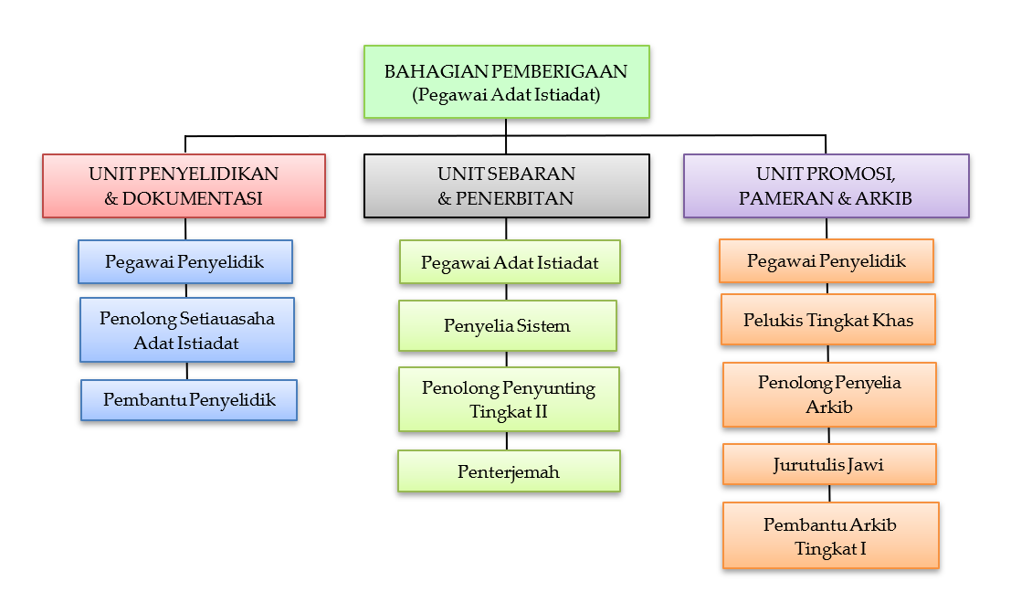 Bahagian Pemberigaan ini mengandungi tiga unit, iaitu Unit Penyelidikan & Dokumentasi, Unit Sebaran & Penerbitan dan Unit Promosi, Pameran & Arkib. Bahagian ini diketuai oleh Pegawai Adat Istiadat.